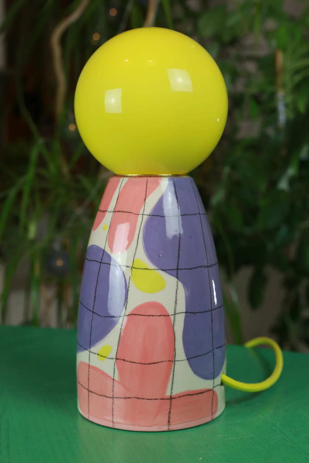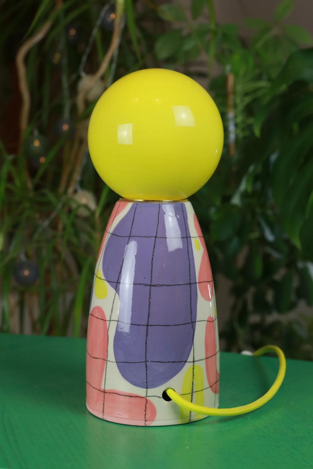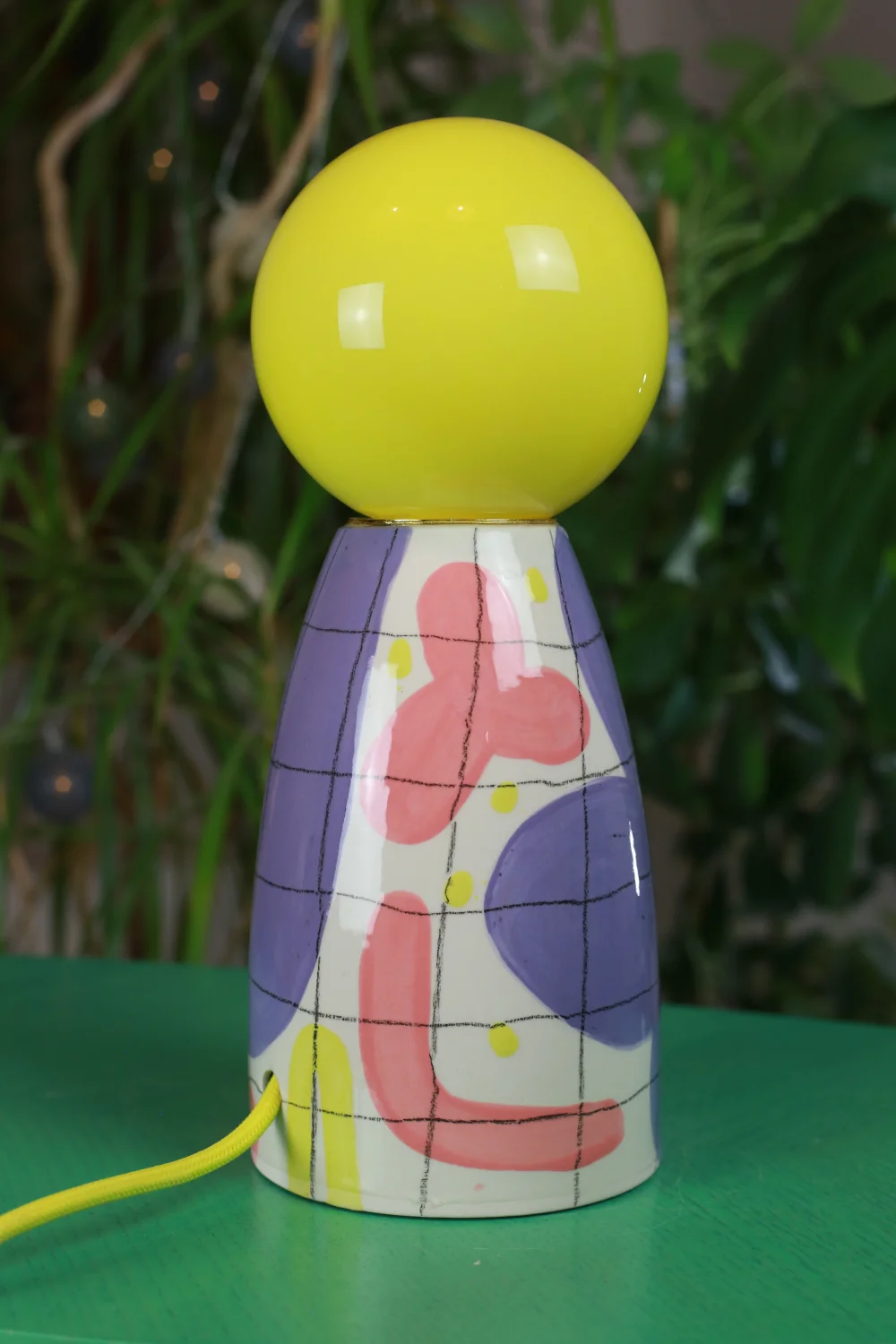 Ręcznie robiona, ceramiczna lampa w zestawie z żółtym, szklanym kloszem nasadzanym na oprawkę żarówki