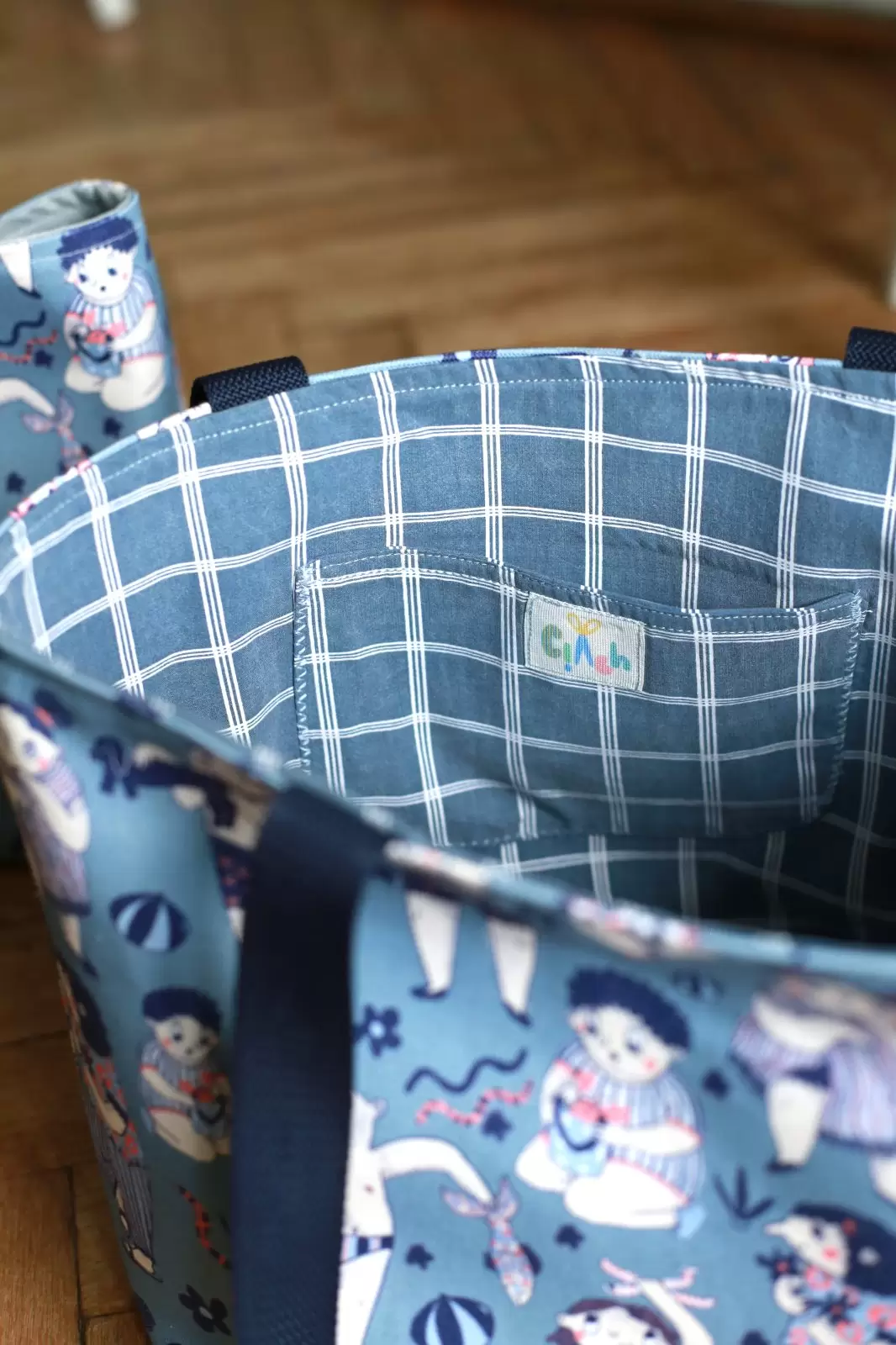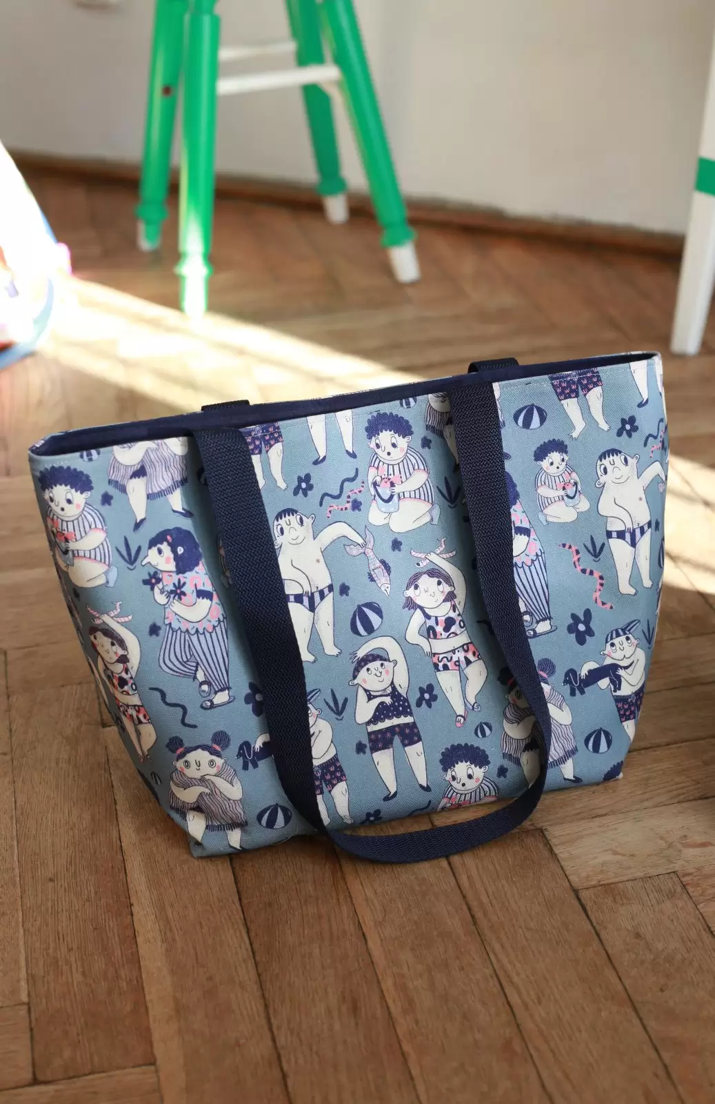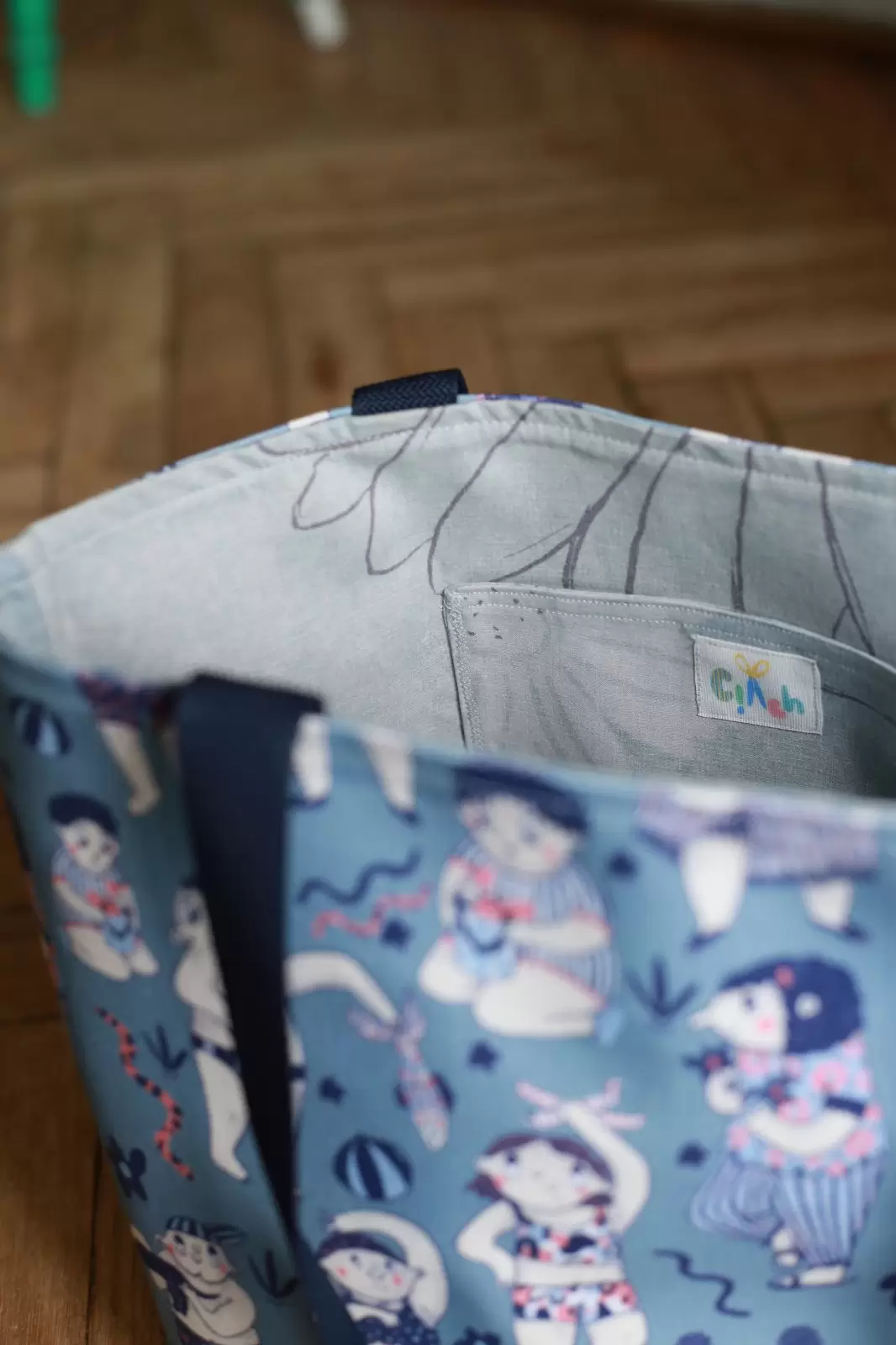 Torba szyta przez moją Mamę z wzorem mojego projektu z granatową podszewką. Ma w środku sporo kieszonek, które ułatwiają panowanie nad jej zawartością.