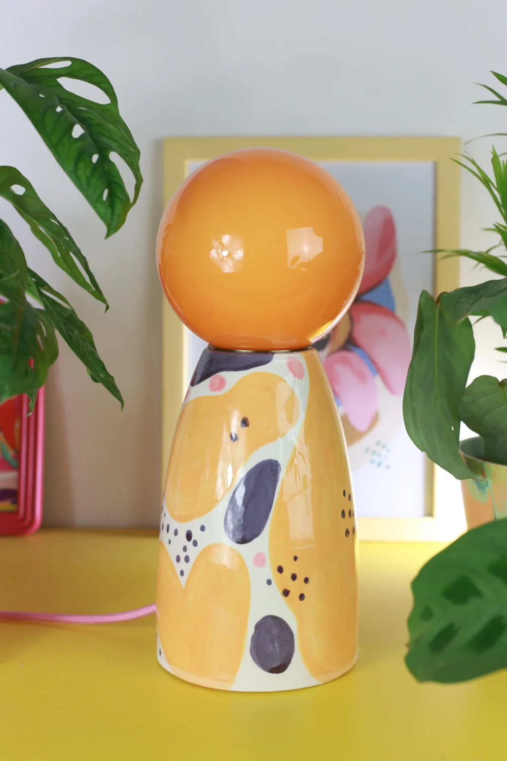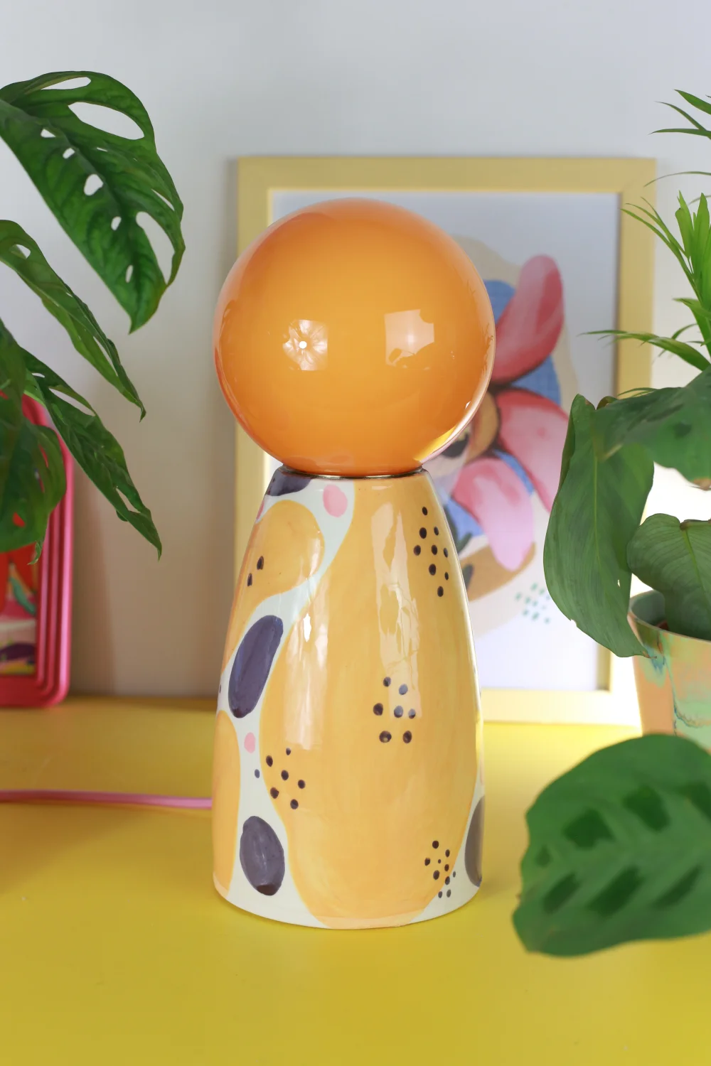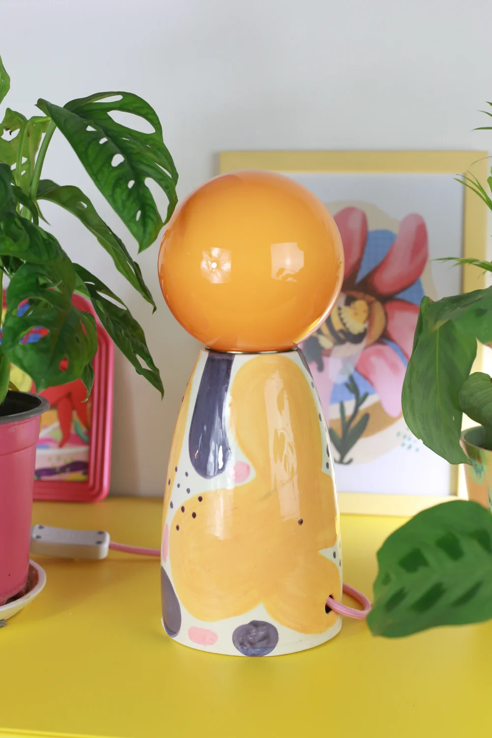 Ręcznie robiona, ceramiczna lampa w zestawie z żółtym, szklanym kloszem nasadzanym na oprawkę żarówki