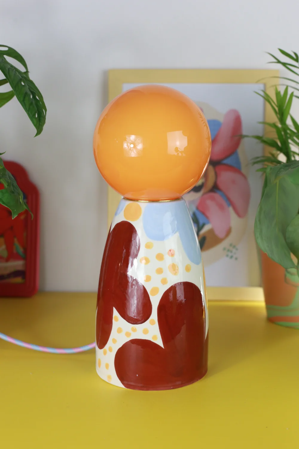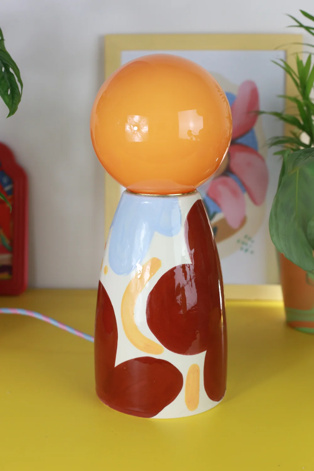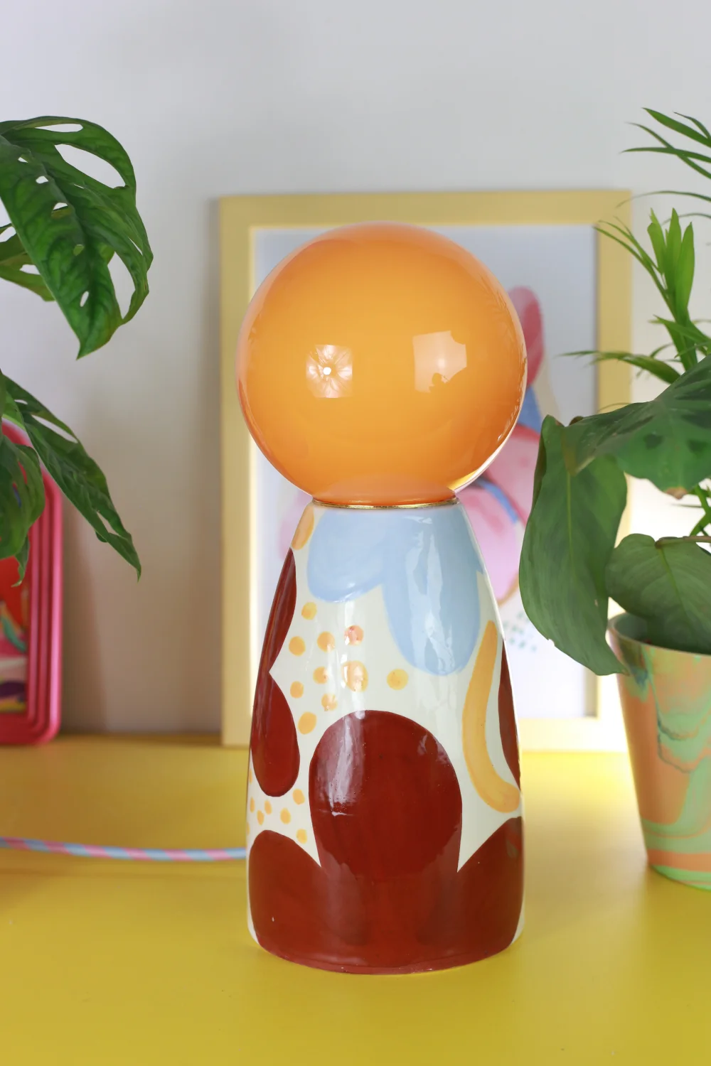 Ręcznie robiona, ceramiczna lampa w zestawie z żółtym, szklanym kloszem nasadzanym na oprawkę żarówki