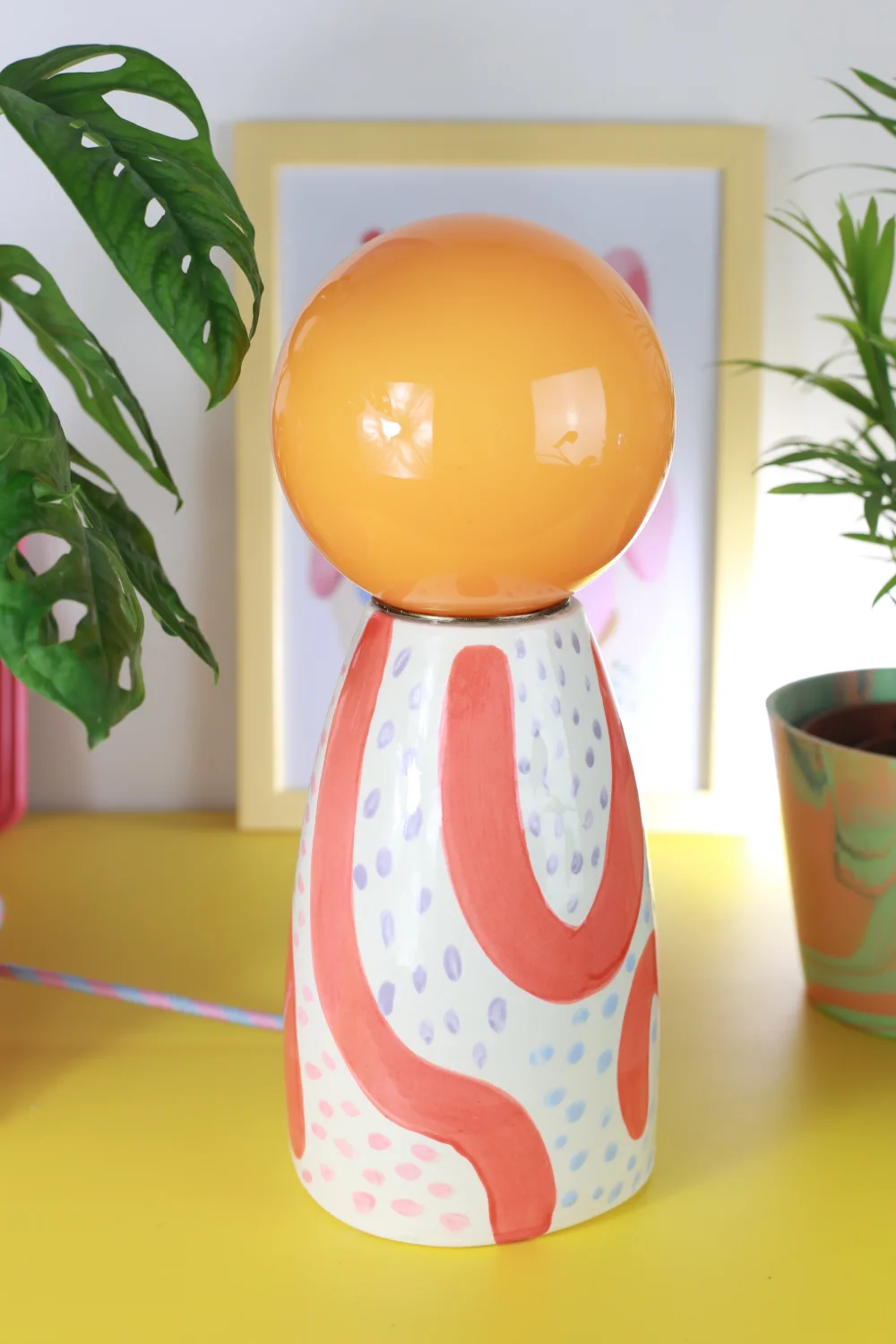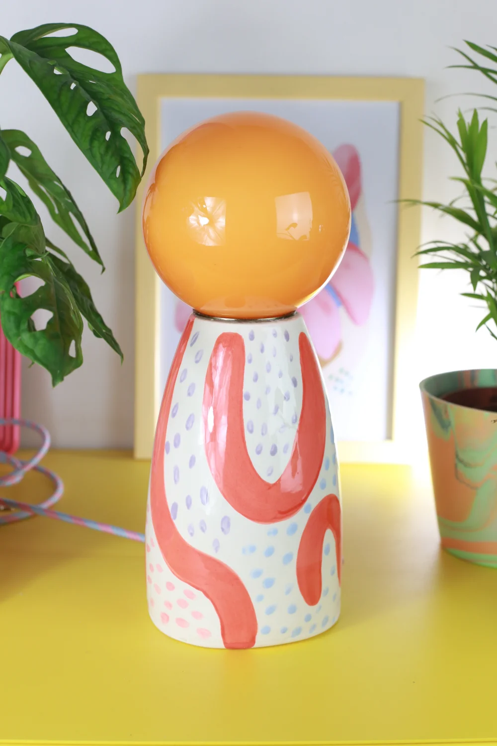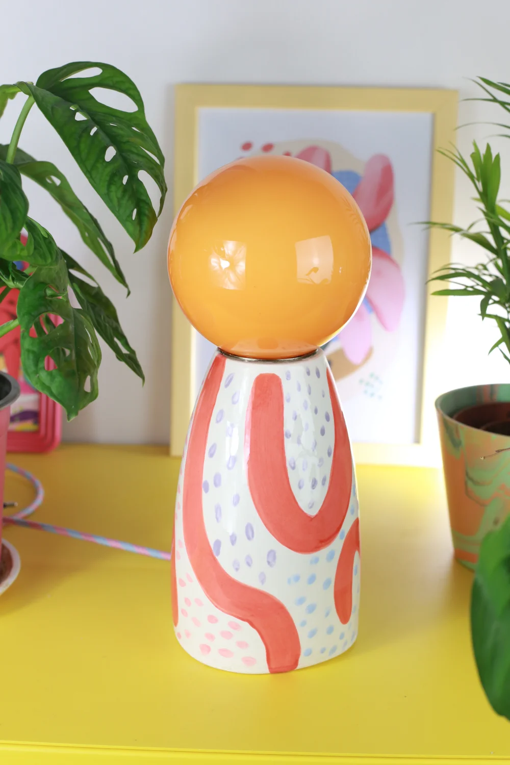 Ręcznie robiona, ceramiczna lampa w zestawie z żółtym, szklanym kloszem nasadzanym na oprawkę żarówki