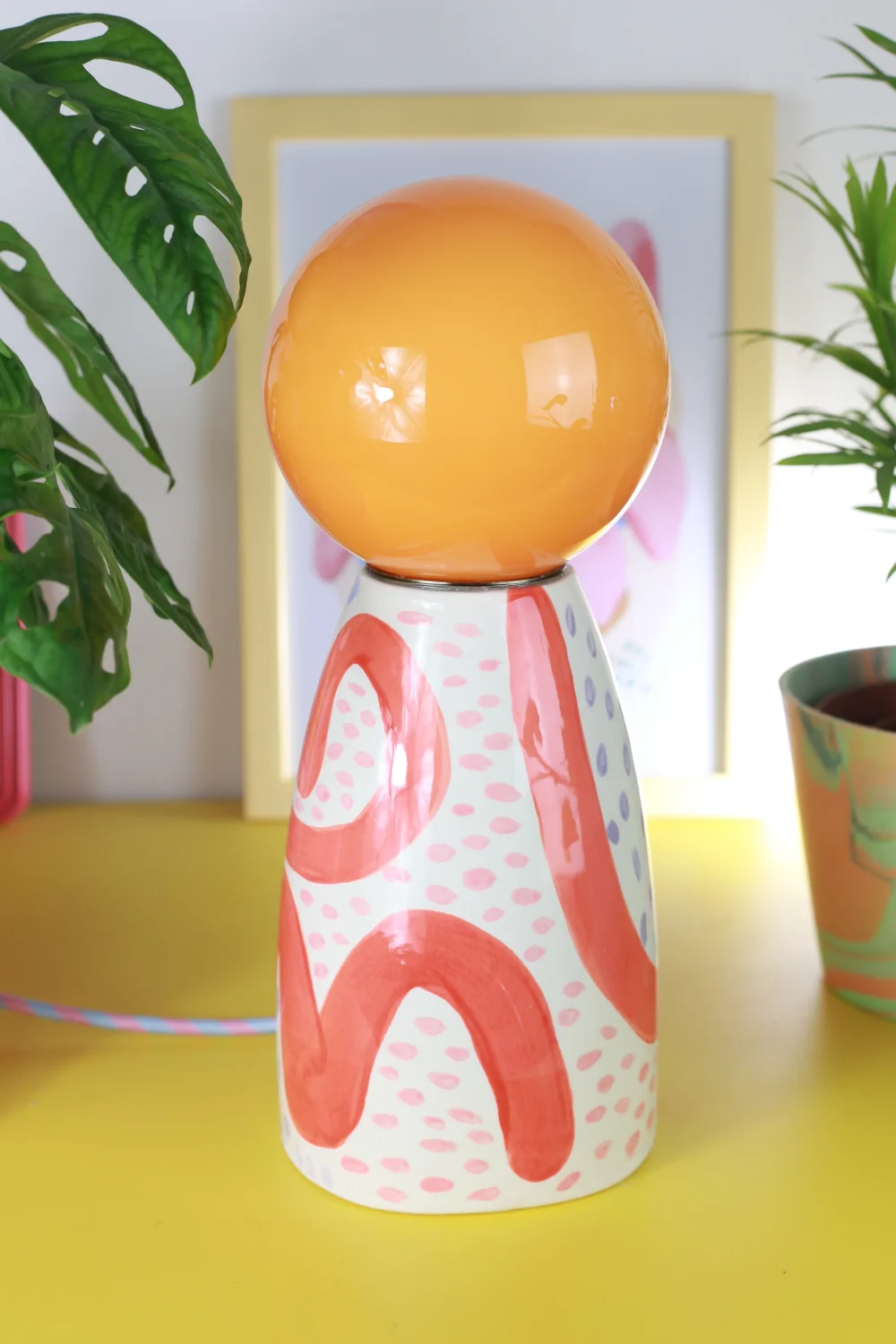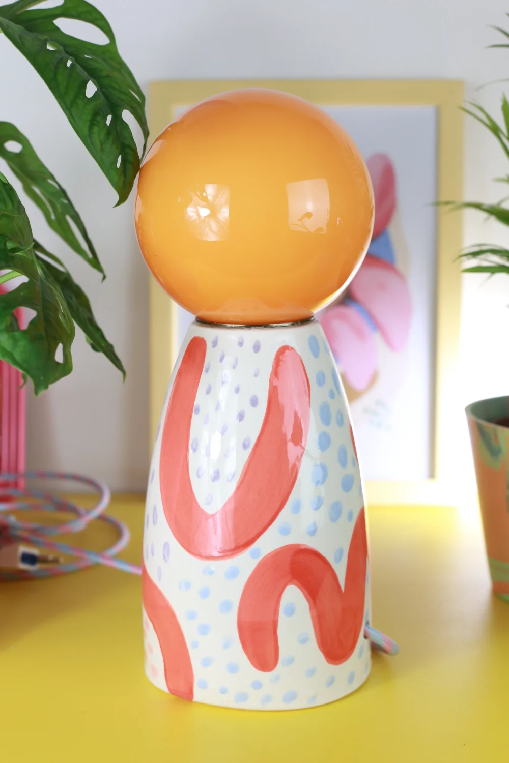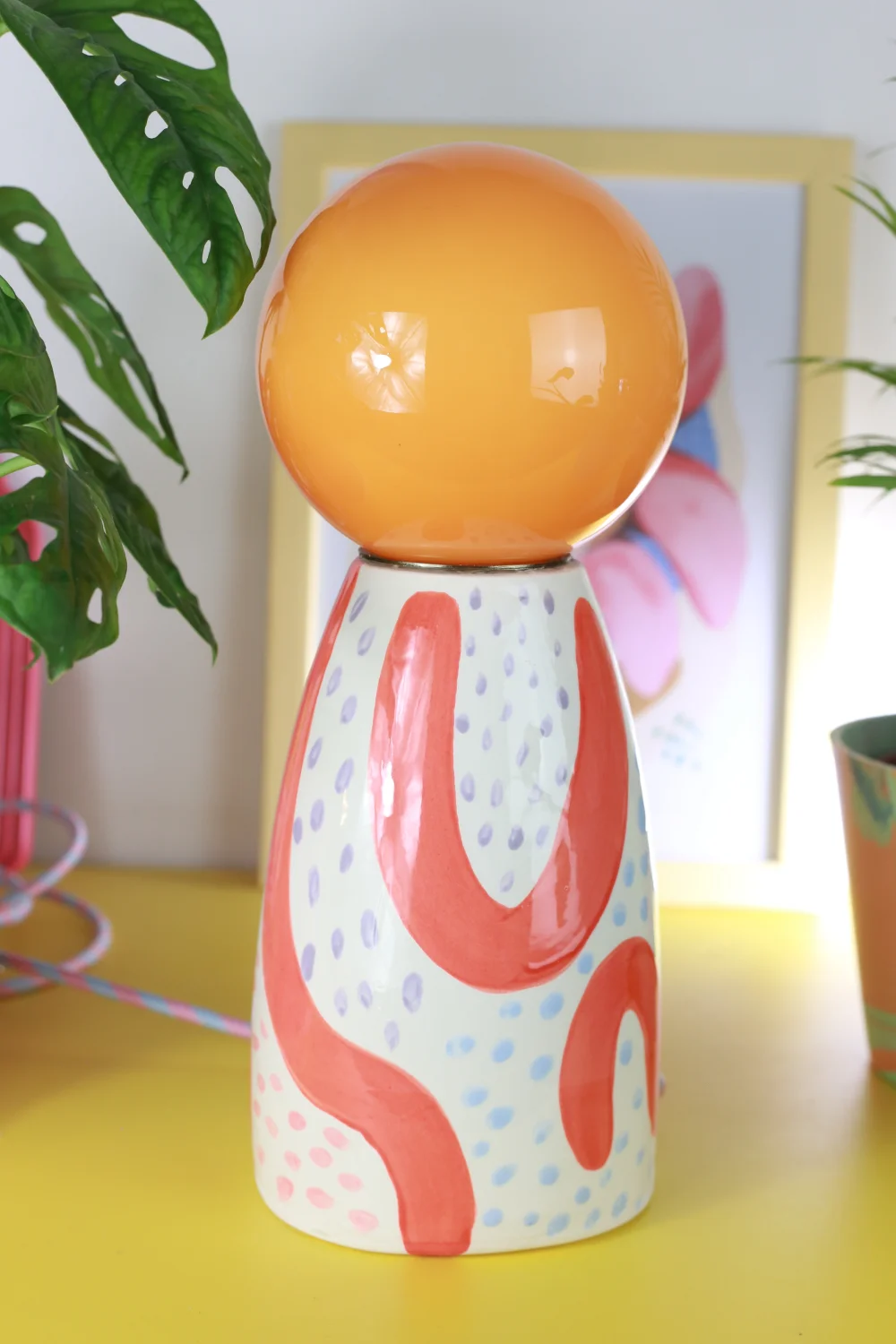 Ręcznie robiona, ceramiczna lampa w zestawie z żółtym, szklanym kloszem nasadzanym na oprawkę żarówki