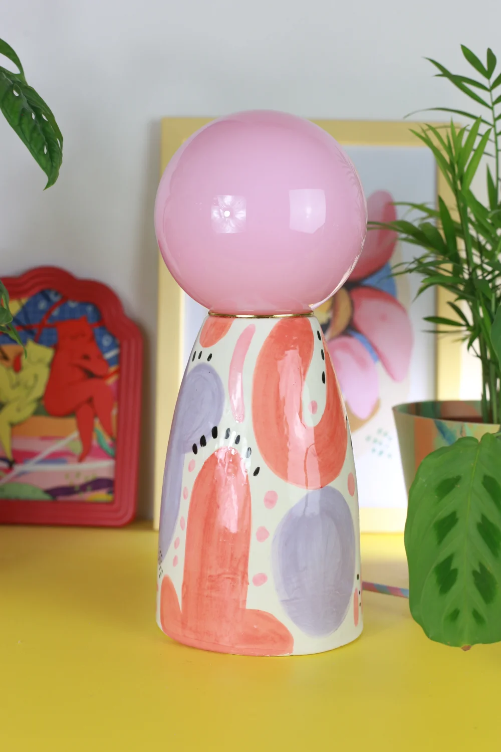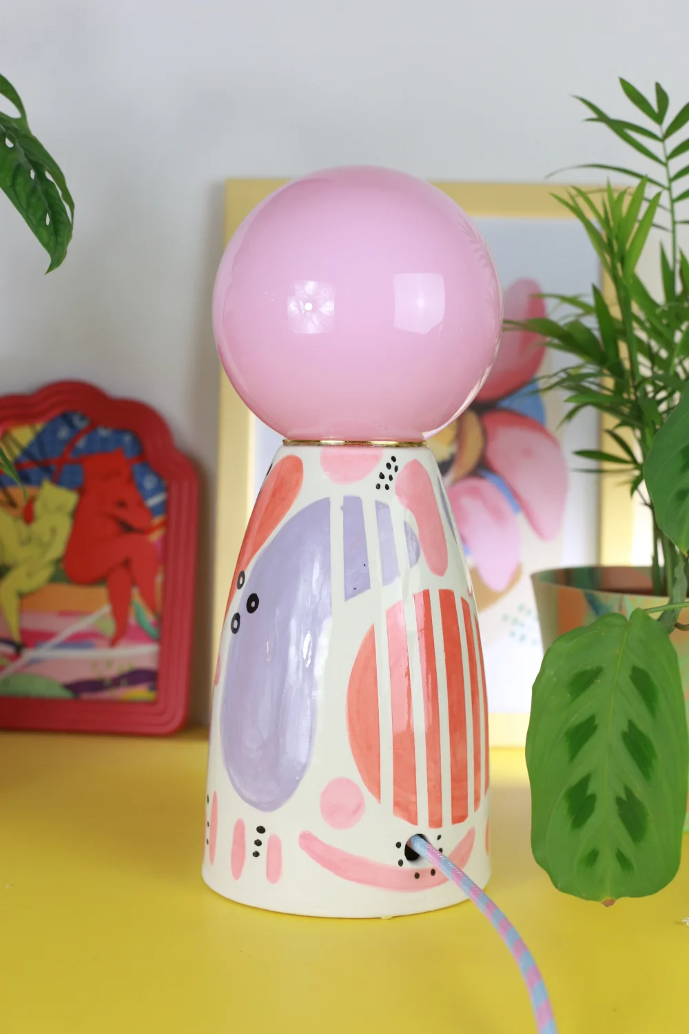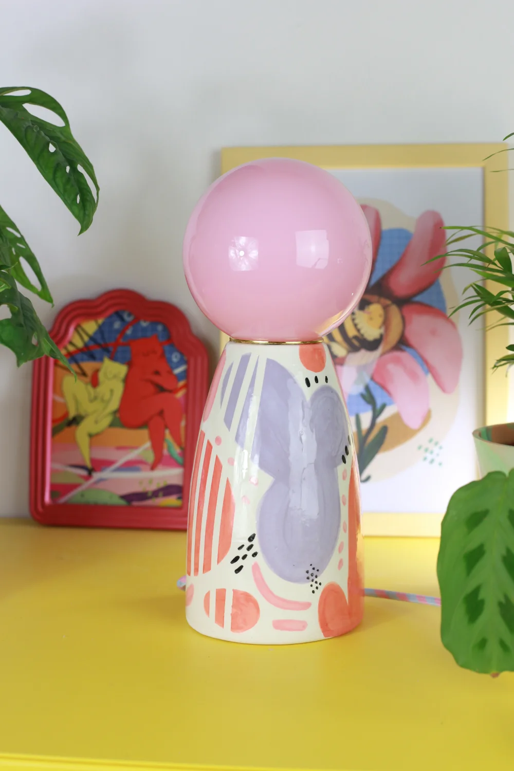 Ręcznie robiona, ceramiczna lampa w zestawie z żółtym, szklanym kloszem nasadzanym na oprawkę żarówki