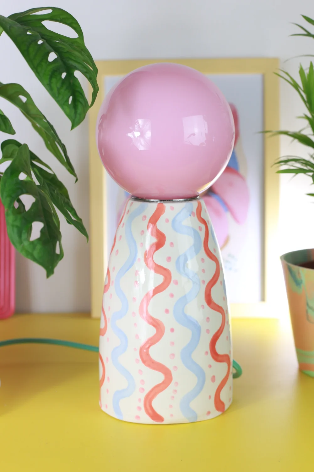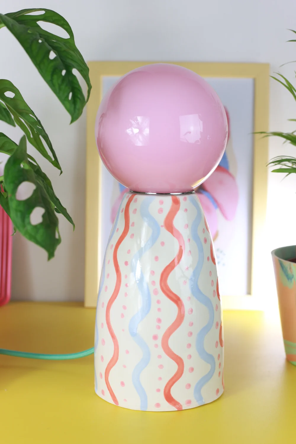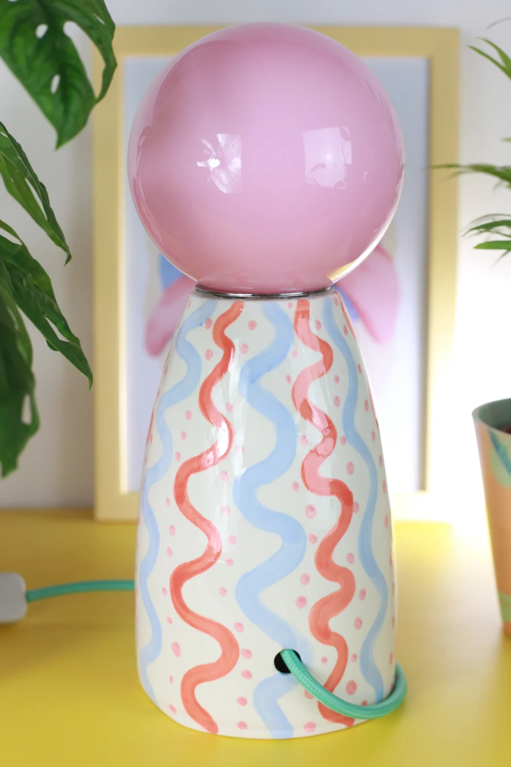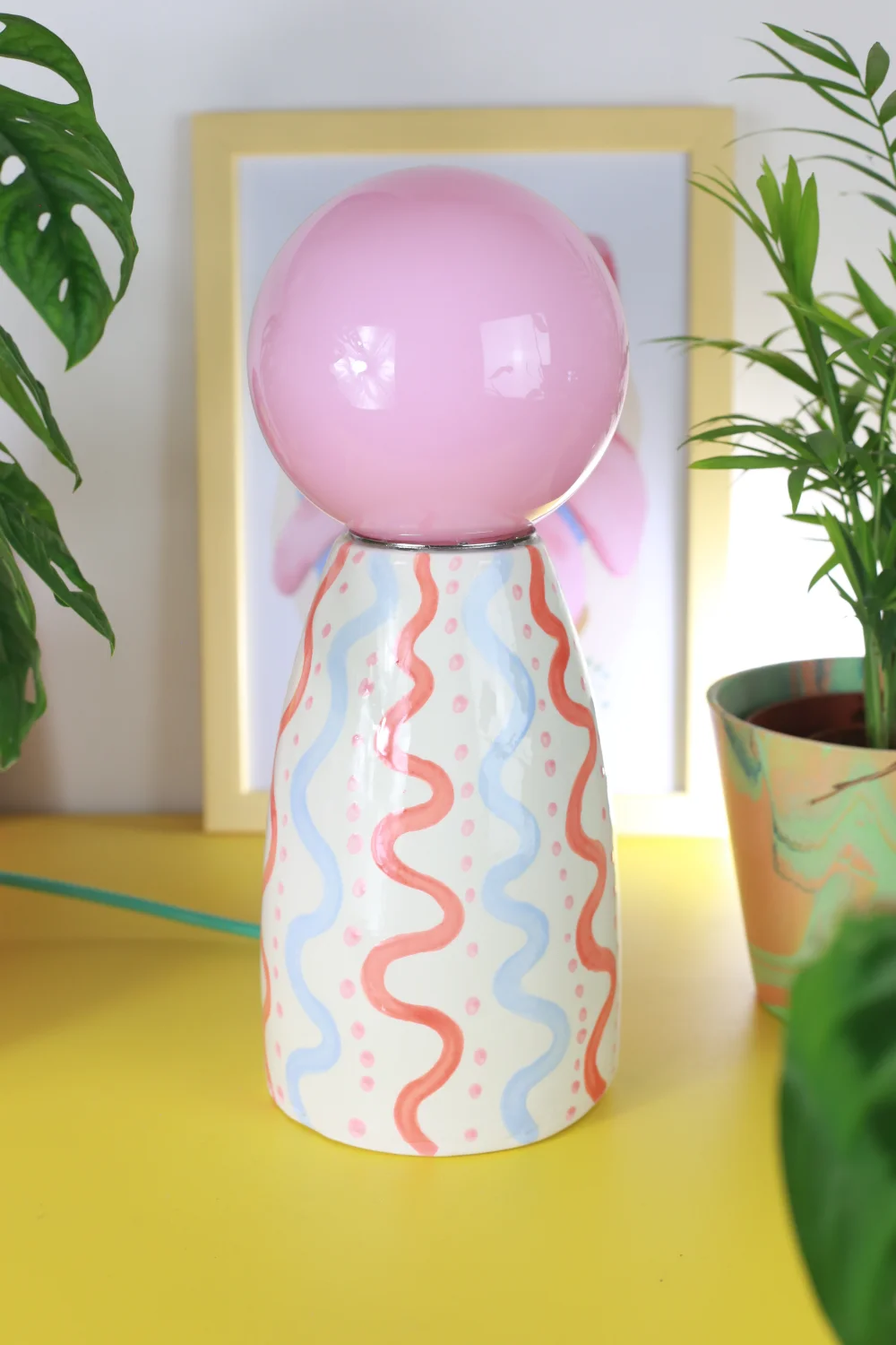 Ręcznie robiona, ceramiczna lampa w zestawie z żółtym, szklanym kloszem nasadzanym na oprawkę żarówki